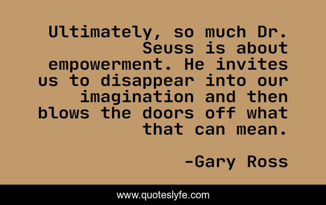 This page presents the quote "Ultimately, so much Dr. Seuss is about empowerment. He invites us to disappear into our imagination and then blows the doors off what that can mean.". Author of this quote is Gary Ross. This quote is about empowerment, doors, mean,.