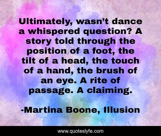 This page presents the quote "Ultimately, wasn’t dance a whispered question? A story told through the position of a foot, the tilt of a head, the touch of a hand, the brush of an eye. A rite of passage. A claiming.". Author of this quote is Martina Boone, Illusion. This quote is about falling-in-love, love, dancing, dance, claiming, lovers, dancing-together, affection,.