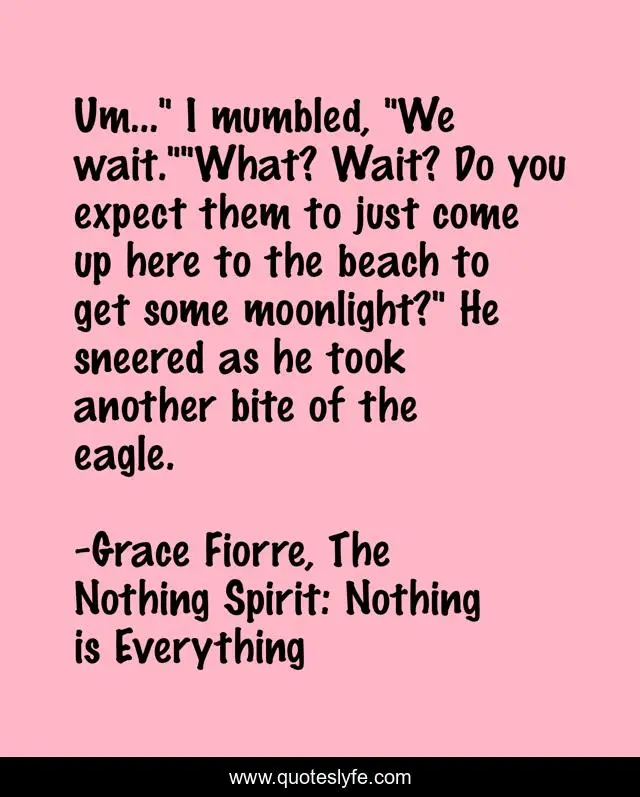 This page presents the quote "Um..." I mumbled, "We wait.""What? Wait? Do you expect them to just come up here to the beach to get some moonlight?" He sneered as he took another bite of the eagle.". Author of this quote is Grace Fiorre, The Nothing Spirit: Nothing is Everything. This quote is about funny, waiting, comedy, beach, impatience,.