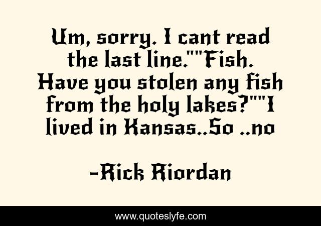 This page presents the quote "Um, sorry. I cant read the last line.""Fish. Have you stolen any fish from the holy lakes?""I lived in Kansas..So ..no". Author of this quote is Rick Riordan. This quote is about ghosts, serpent-s-shadow,.