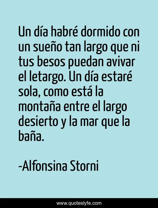 This page presents the quote "Un día habré dormido con un sueño tan largo que ni tus besos puedan avivar el letargo. Un día estaré sola, como está la montaña entre el largo desierto y la mar que la baña.". Author of this quote is Alfonsina Storni. .