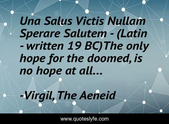 This page presents the quote "Una Salus Victis Nullam Sperare Salutem - (Latin - written 19 BC)The only hope for the doomed, is no hope at all...". Author of this quote is Virgil, The Aeneid. .