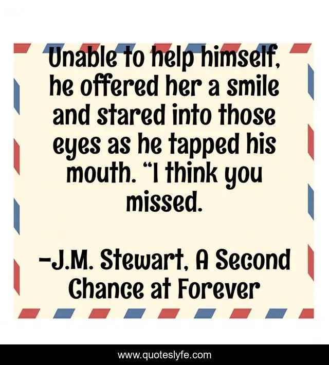 This page presents the quote "Unable to help himself, he offered her a smile and stared into those eyes as he tapped his mouth. “I think you missed.". Author of this quote is J.M. Stewart, A Second Chance at Forever. This quote is about vegas, childhood-friends, second-chances, contemporary-romance,.