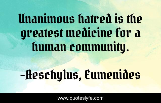 This page presents the quote "Unanimous hatred is the greatest medicine for a human community.". Author of this quote is Aeschylus, Eumenides. This quote is about politics, ritual, hate, thanksgiving, community,.