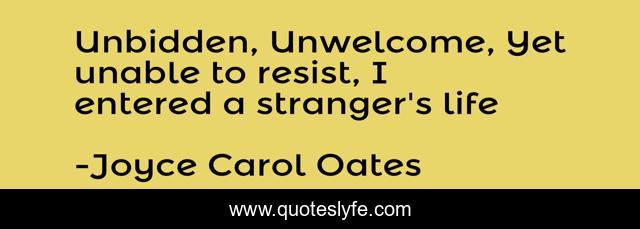This page presents the quote "Unbidden, Unwelcome, Yet unable to resist, I entered a stranger's life". Author of this quote is Joyce Carol Oates. .