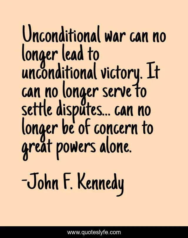 This page presents the quote "Unconditional war can no longer lead to unconditional victory. It can no longer serve to settle disputes... can no longer be of concern to great powers alone.". Author of this quote is John F. Kennedy. This quote is about alone, great, victory,.