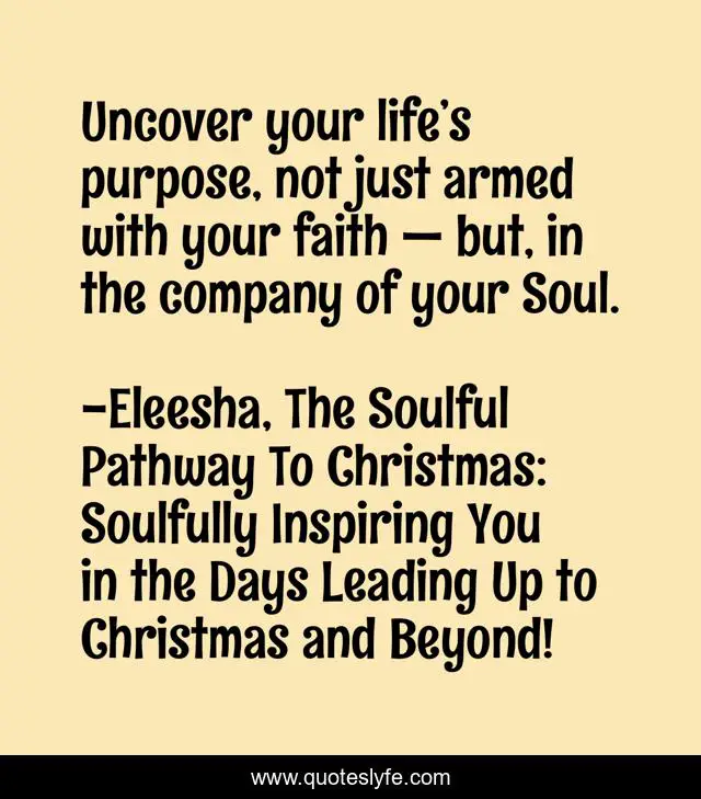 This page presents the quote "Uncover your life’s purpose, not just armed with your faith — but, in the company of your Soul.". Author of this quote is Eleesha, The Soulful Pathway To Christmas: Soulfully Inspiring You in the Days Leading Up to Christmas and Beyond!. This quote is about christmas-spirit, positive, motivational, empowerment, soul, quotes, channeling, inspirational, affirmations,.