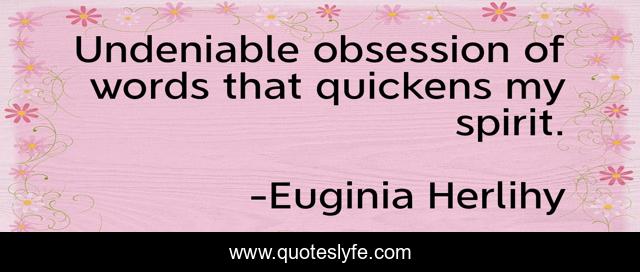 This page presents the quote "Undeniable obsession of words that quickens my spirit.". Author of this quote is Euginia Herlihy. .
