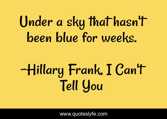 This page presents the quote "Under a sky that hasn't been blue for weeks.". Author of this quote is Hillary Frank, I Can't Tell You. This quote is about blue, weeks, sky, under,.