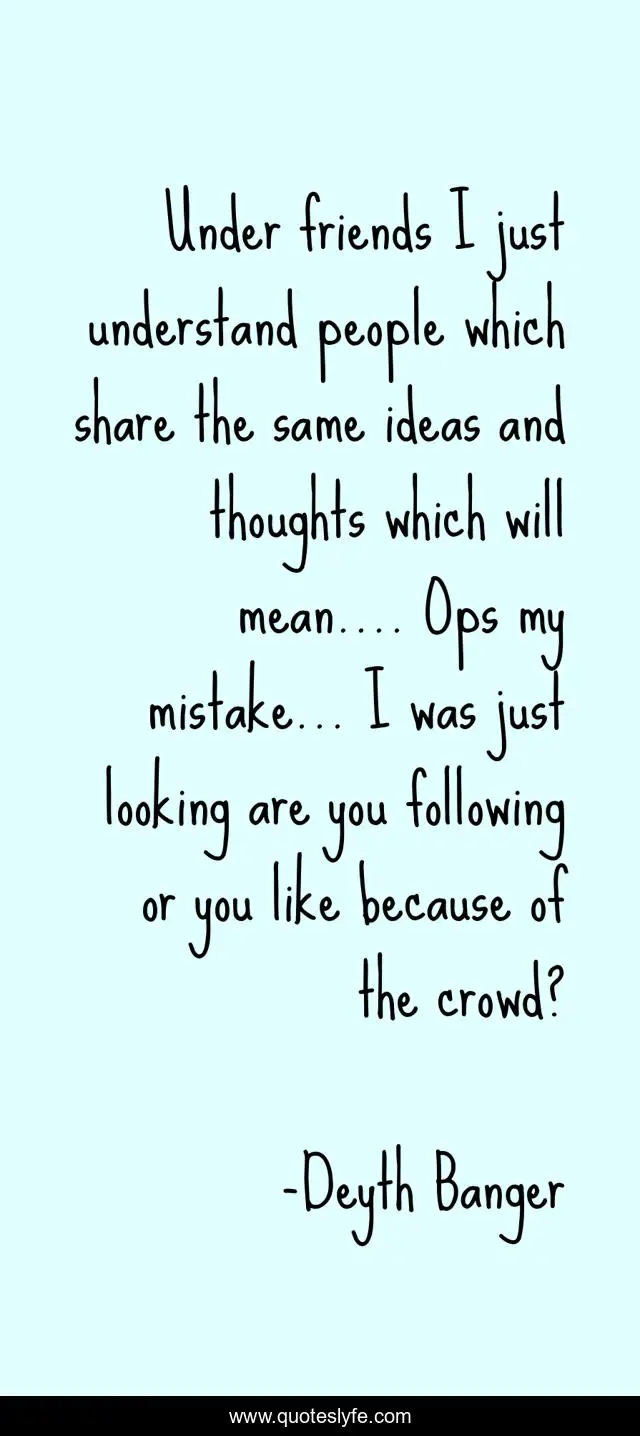 This page presents the quote "Under friends I just understand people which share the same ideas and thoughts which will mean.... Ops my mistake... I was just looking are you following or you like because of the crowd?". Author of this quote is Deyth Banger. This quote is about crowd, friends, just, which, people,.