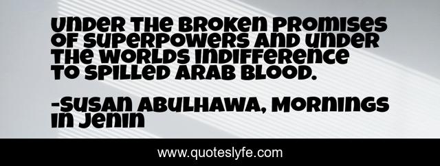 This page presents the quote "Under the broken promises of superpowers and under the worlds indifference to spilled Arab blood.". Author of this quote is Susan Abulhawa, Mornings in Jenin. This quote is about arab, broken, promise, blood,.