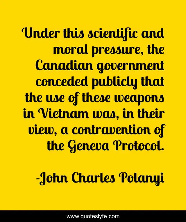 This page presents the quote "Under this scientific and moral pressure, the Canadian government conceded publicly that the use of these weapons in Vietnam was, in their view, a contravention of the Geneva Protocol.". Author of this quote is John Charles Polanyi. This quote is about pressure, moral, view,.