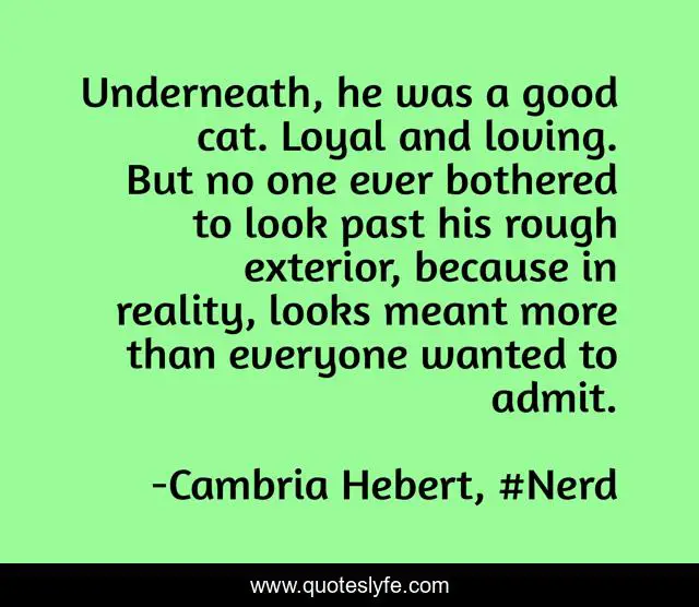 This page presents the quote "Underneath, he was a good cat. Loyal and loving. But no one ever bothered to look past his rough exterior, because in reality, looks meant more than everyone wanted to admit.". Author of this quote is Cambria Hebert, #Nerd. This quote is about truth-of-life, truth, reality,.
