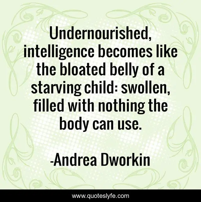 This page presents the quote "Undernourished, intelligence becomes like the bloated belly of a starving child: swollen, filled with nothing the body can use.". Author of this quote is Andrea Dworkin. This quote is about body, nothing, child,.