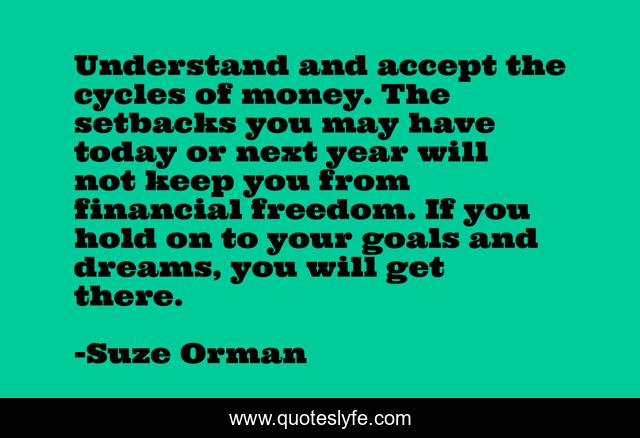 This page presents the quote "Understand and accept the cycles of money. The setbacks you may have today or next year will not keep you from financial freedom. If you hold on to your goals and dreams, you will get there.". Author of this quote is Suze Orman. This quote is about freedom, today, money,.