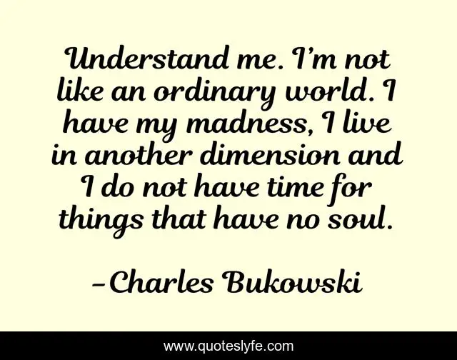 This page presents the quote "Understand me. I’m not like an ordinary world. I have my madness, I live in another dimension and I do not have time for things that have no soul.". Author of this quote is Charles Bukowski. This quote is about understand-me, reality, madness, dimension, soul,.