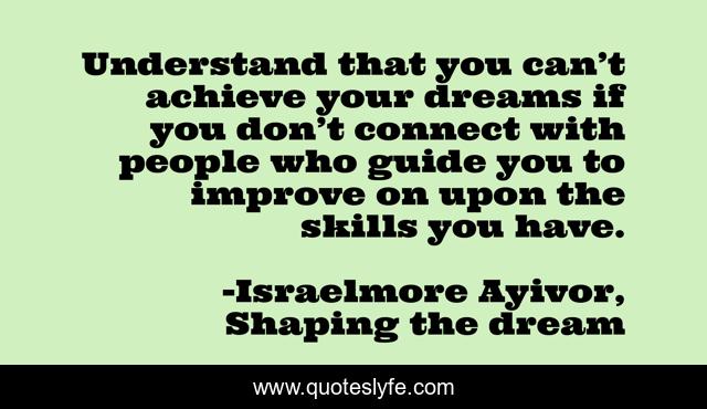 This page presents the quote "Understand that you can’t achieve your dreams if you don’t connect with people who guide you to improve on upon the skills you have.". Author of this quote is Israelmore Ayivor, Shaping the dream. This quote is about food-for-thought, networking, dreams-big, skillful, people, mentors, skills, connection, understand,.
