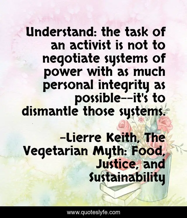 This page presents the quote "Understand: the task of an activist is not to negotiate systems of power with as much personal integrity as possible--it's to dismantle those systems.". Author of this quote is Lierre Keith, The Vegetarian Myth: Food, Justice, and Sustainability. This quote is about environment, environmentalism, activism, vegetarianism, radicalism,.