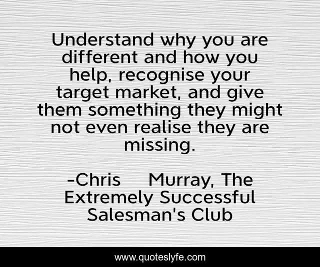 "Chris Murray, The Extremely Successful Salesman's Club Quotes." Quoteslyfe.com, 2025. Sun. 14 Dec. 2025. <https://www.quoteslyfe.com/quote/Understand-why-you-are-different-and-how-109722>.