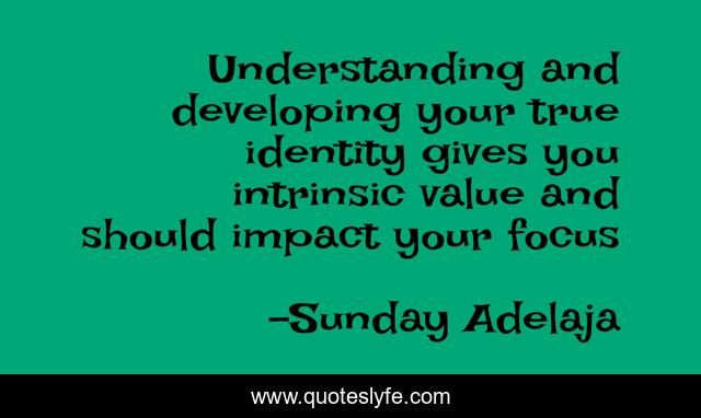 This page presents the quote "Understanding and developing your true identity gives you intrinsic value and should impact your focus". Author of this quote is Sunday Adelaja. This quote is about development, true-identity, focus, value, understanding, purpose, intrinsic,.