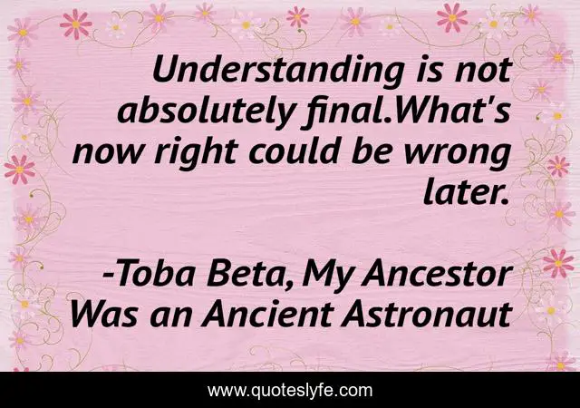 This page presents the quote "Understanding is not absolutely final.What's now right could be wrong later.". Author of this quote is Toba Beta, My Ancestor Was an Ancient Astronaut. This quote is about time, point-of-view, change, understanding,.