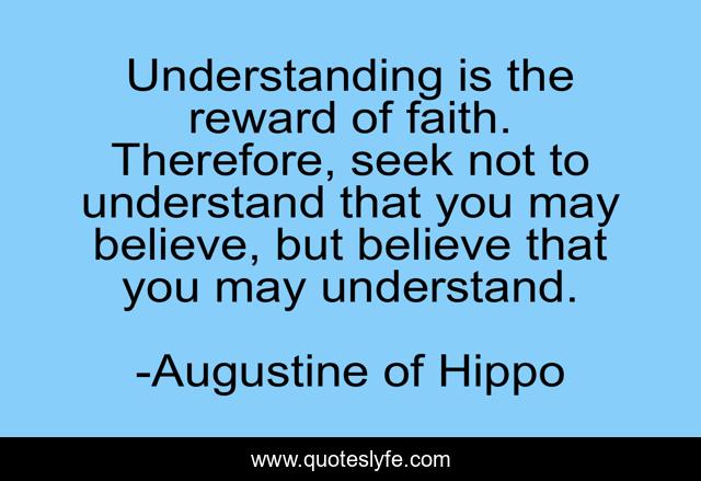 This page presents the quote "Understanding is the reward of faith. Therefore, seek not to understand that you may believe, but believe that you may understand.". Author of this quote is Augustine of Hippo. This quote is about faith, inspirational, enthusiasm,.