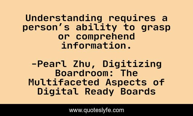This page presents the quote "Understanding requires a person’s ability to grasp or comprehend information.". Author of this quote is Pearl Zhu, Digitizing Boardroom: The Multifaceted Aspects of Digital Ready Boards. This quote is about thinking, understanding,.