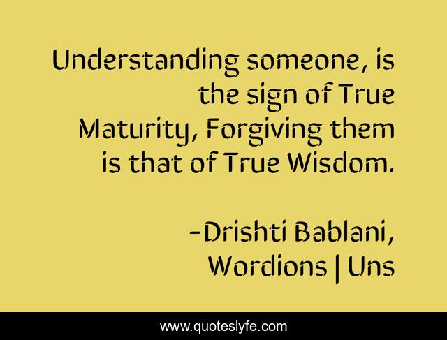 This page presents the quote "Understanding someone, is the sign of True Maturity, Forgiving them is that of True Wisdom.". Author of this quote is Drishti Bablani, Wordions | Uns. This quote is about wordions-com, drishti-bablani, uns, understanding-others, wordions, wisdom, maturity, forgiving-others,.