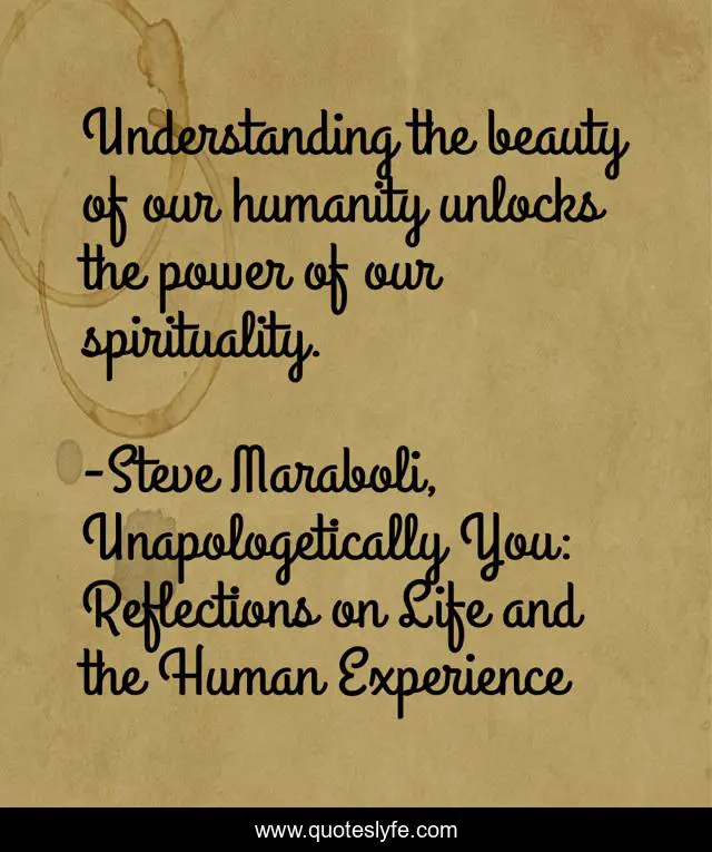 This page presents the quote "Understanding the beauty of our humanity unlocks the power of our spirituality.". Author of this quote is Steve Maraboli, Unapologetically You: Reflections on Life and the Human Experience. This quote is about life, power, understanding, spirituality, inspirational, enthusiasm, humanity,.