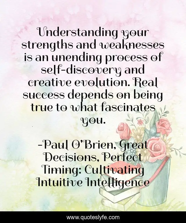 This page presents the quote "Understanding your strengths and weaknesses is an unending process of self-discovery and creative evolution. Real success depends on being true to what fascinates you.". Author of this quote is Paul O'Brien, Great Decisions, Perfect Timing: Cultivating Intuitive Intelligence. This quote is about success, personal-growth, self-discovery, strengths-and-weaknesses, inspirational, enthusiasm,.