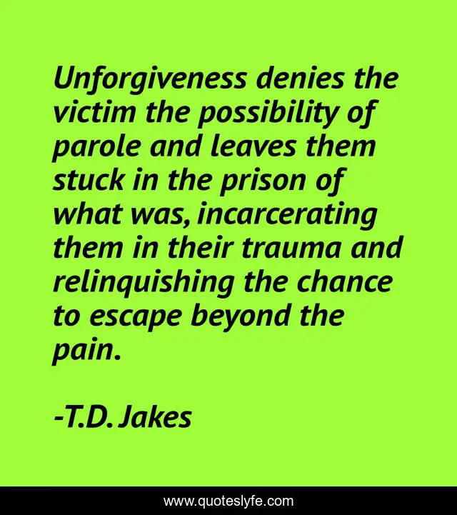 "T.D. Jakes Quotes." Quoteslyfe.com, 2025. Fri. 05 Dec. 2025. <https://www.quoteslyfe.com/quote/Unforgiveness-denies-the-victim-the-possibility-of-19529>.