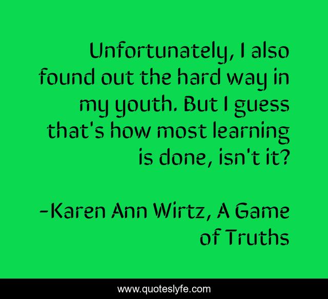 This page presents the quote "Unfortunately, I also found out the hard way in my youth. But I guess that's how most learning is done, isn't it?". Author of this quote is Karen Ann Wirtz, A Game of Truths. This quote is about ignorance, trial-and-error, youth, mistakes, curiosity, learn, learnung,.