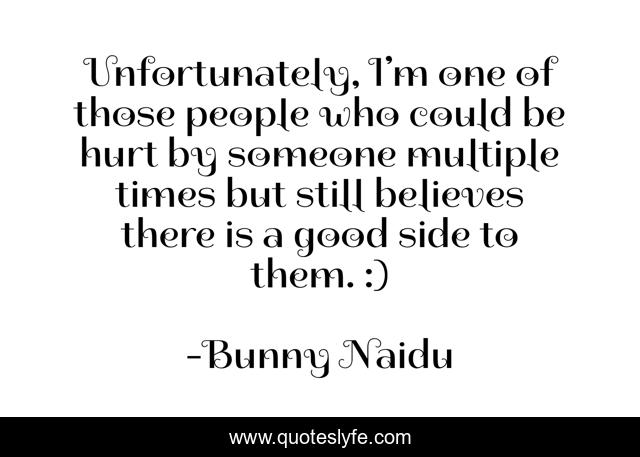 This page presents the quote "Unfortunately, I’m one of those people who could be hurt by someone multiple times but still believes there is a good side to them. :)". Author of this quote is Bunny Naidu. This quote is about peace-of-mind, foolishness, positive-thinking,.