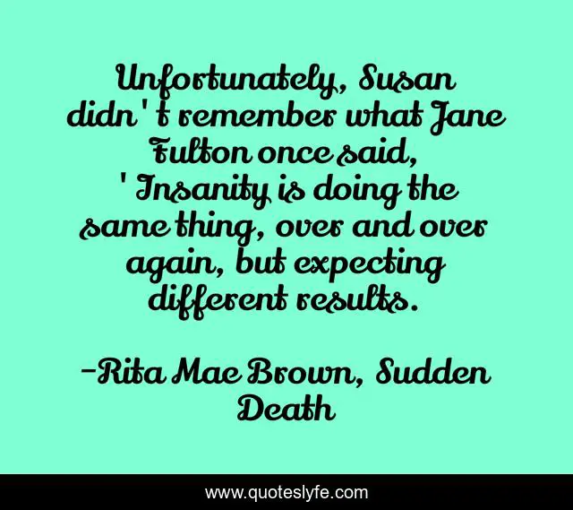 This page presents the quote "Unfortunately, Susan didn't remember what Jane Fulton once said, 'Insanity is doing the same thing, over and over again, but expecting different results.". Author of this quote is Rita Mae Brown, Sudden Death. This quote is about paraphrasing-narcotics-anonymous, misattributed-jane-fulton, insanity,.