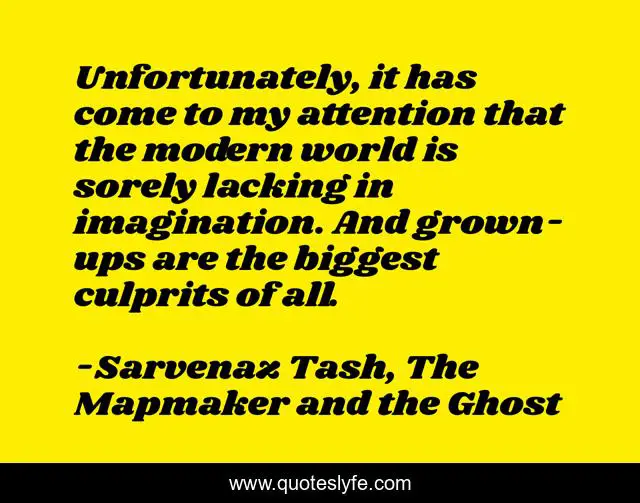 This page presents the quote "Unfortunately, it has come to my attention that the modern world is sorely lacking in imagination. And grown-ups are the biggest culprits of all.". Author of this quote is Sarvenaz Tash, The Mapmaker and the Ghost. This quote is about imagination, growing-up,.