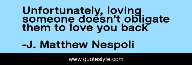 This page presents the quote "Unfortunately, loving someone doesn't obligate them to love you back". Author of this quote is J. Matthew Nespoli. This quote is about being-loved, falling-in-love, love, affection, loving,.