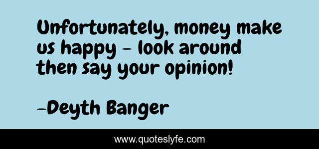 This page presents the quote "Unfortunately, money make us happy - look around then say your opinion!". Author of this quote is Deyth Banger. This quote is about fortunately, money, unfortunately, opinion,.