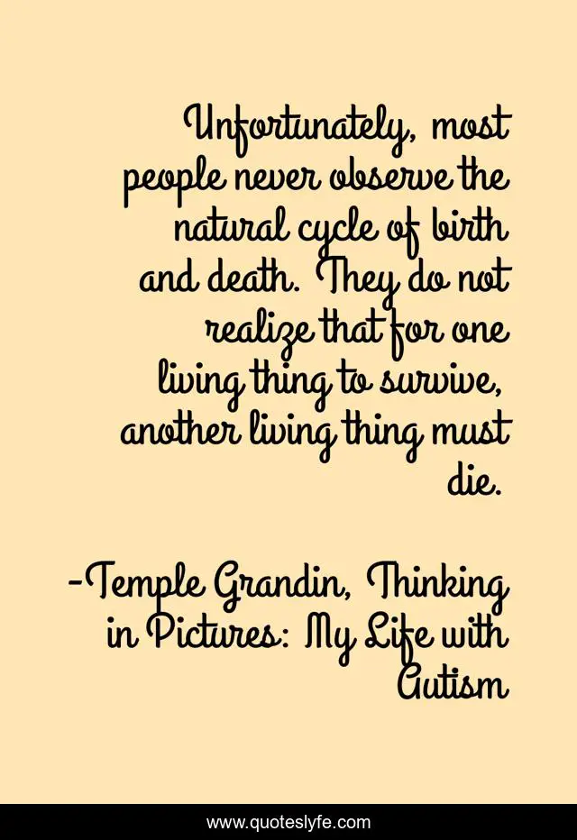 This page presents the quote "Unfortunately, most people never observe the natural cycle of birth and death. They do not realize that for one living thing to survive, another living thing must die.". Author of this quote is Temple Grandin, Thinking in Pictures: My Life with Autism. .
