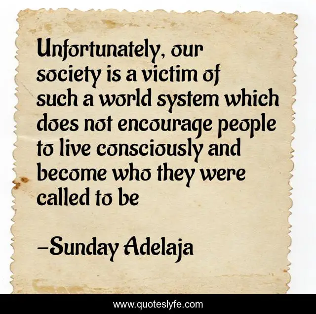 This page presents the quote "Unfortunately, our society is a victim of such a world system which does not encourage people to live consciously and become who they were called to be". Author of this quote is Sunday Adelaja. This quote is about life, people, system, encouragement, society, victim, world,.