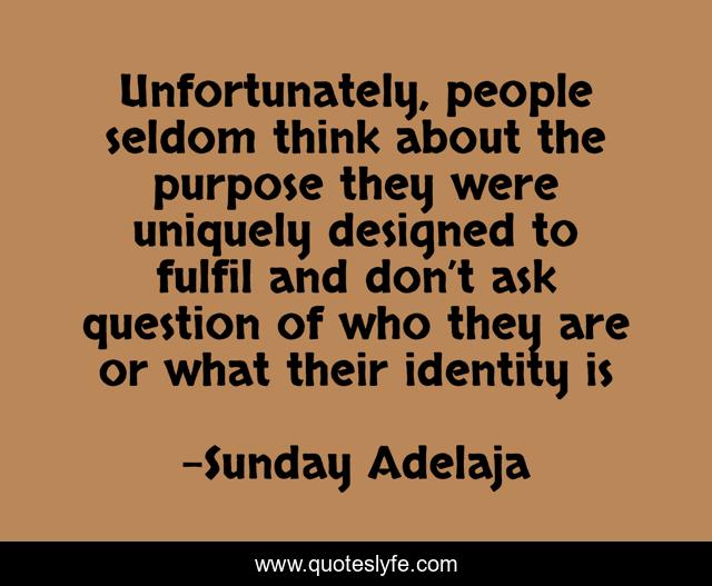 This page presents the quote "Unfortunately, people seldom think about the purpose they were uniquely designed to fulfil and don’t ask question of who they are or what their identity is". Author of this quote is Sunday Adelaja. This quote is about fulfillment, people, purpose, identity, purposeful-thinking,.
