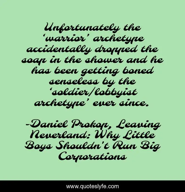 This page presents the quote "Unfortunately the ‘warrior’ archetype accidentally dropped the soap in the shower and he has been getting boned senseless by the ‘soldier/lobbyist archetype’ ever since.". Author of this quote is Daniel Prokop, Leaving Neverland: Why Little Boys Shouldn't Run Big Corporations. This quote is about leaving-neverland, soldier-archetype, warrior-archetype, rites-of-passage, growing-up,.