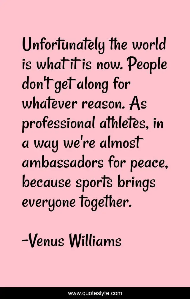 This page presents the quote "Unfortunately the world is what it is now. People don't get along for whatever reason. As professional athletes, in a way we're almost ambassadors for peace, because sports brings everyone together.". Author of this quote is Venus Williams. This quote is about world, peace, together,.