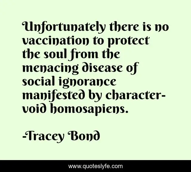 This page presents the quote "Unfortunately there is no vaccination to protect the soul from the menacing disease of social ignorance manifested by character-void homosapiens.". Author of this quote is Tracey Bond. This quote is about battery, hate-speech, n-word, ignorance, racism-in-america,.