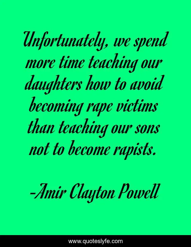 This page presents the quote "Unfortunately, we spend more time teaching our daughters how to avoid becoming rape victims than teaching our sons not to become rapists.". Author of this quote is Amir Clayton Powell. .