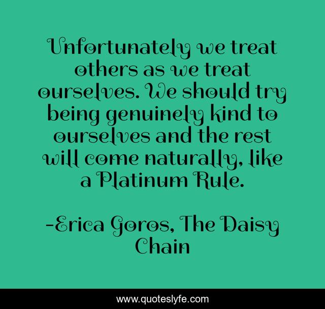 This page presents the quote "Unfortunately we treat others as we treat ourselves. We should try being genuinely kind to ourselves and the rest will come naturally, like a Platinum Rule.". Author of this quote is Erica Goros, The Daisy Chain. This quote is about motivation, compassion, self-help, golden-rule, kindness, betterment, inspiration,.