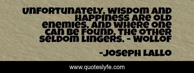 This page presents the quote "Unfortunately, wisdom and happiness are old enemies, and where one can be found, the other seldom lingers. - Wollof". Author of this quote is Joseph Lallo. This quote is about happiness, wisdom,.