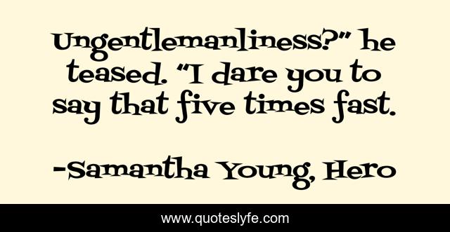 This page presents the quote "Ungentlemanliness?” he teased. “I dare you to say that five times fast.". Author of this quote is Samantha Young, Hero. This quote is about samantha-young, hero,.