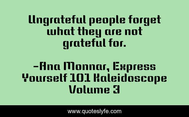 This page presents the quote "Ungrateful people forget what they are not grateful for.". Author of this quote is Ana Monnar, Express Yourself 101 Kaleidoscope Volume 3. This quote is about gratitude, ungrateful, grateful, people,.