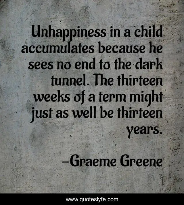 This page presents the quote "Unhappiness in a child accumulates because he sees no end to the dark tunnel. The thirteen weeks of a term might just as well be thirteen years.". Author of this quote is Graeme Greene. This quote is about separation, darkness, emotional-neglect, child-neglect, parenting, boarding-school, childhood, depression,.