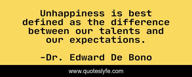 This page presents the quote "Unhappiness is best defined as the difference between our talents and our expectations.". Author of this quote is Dr. Edward De Bono. .